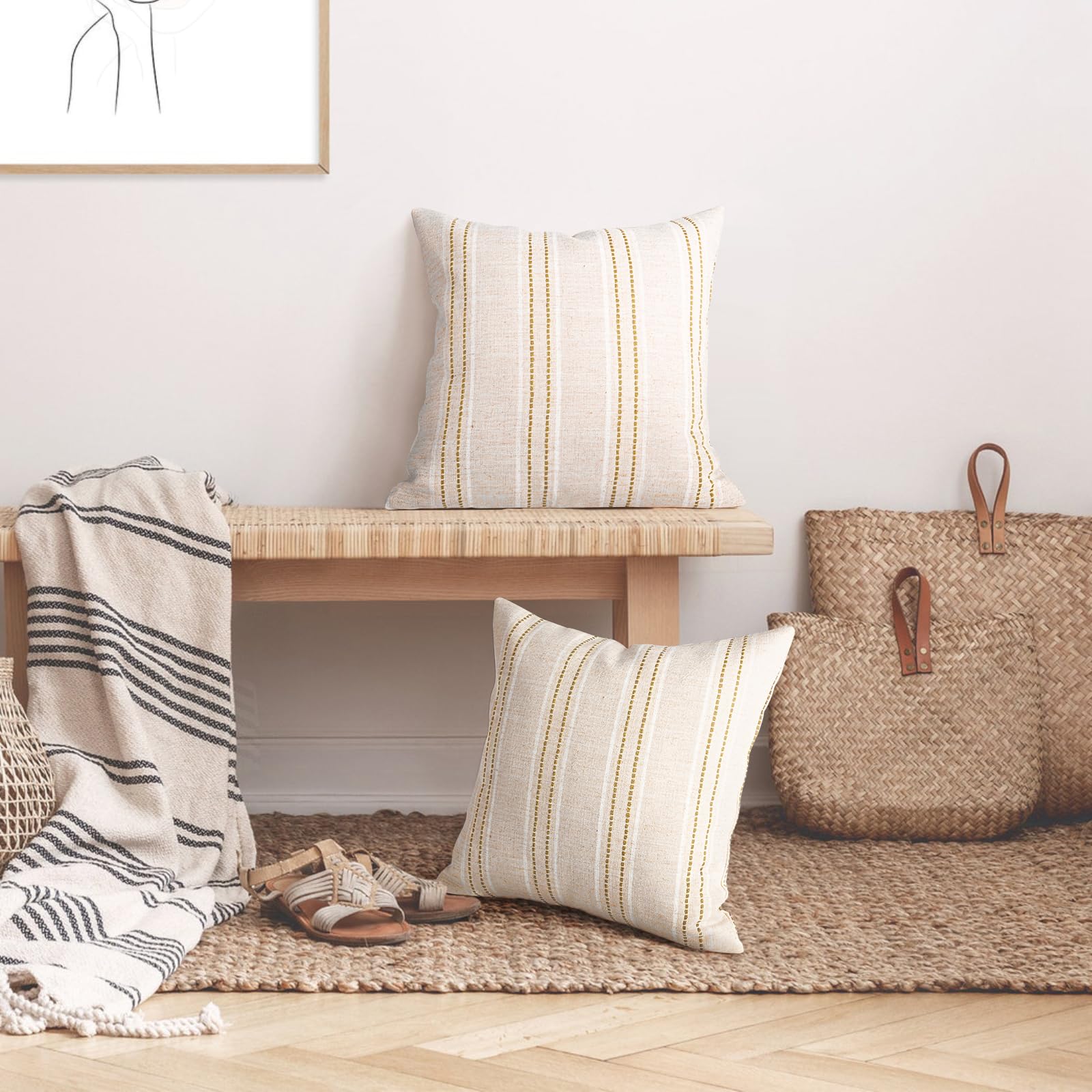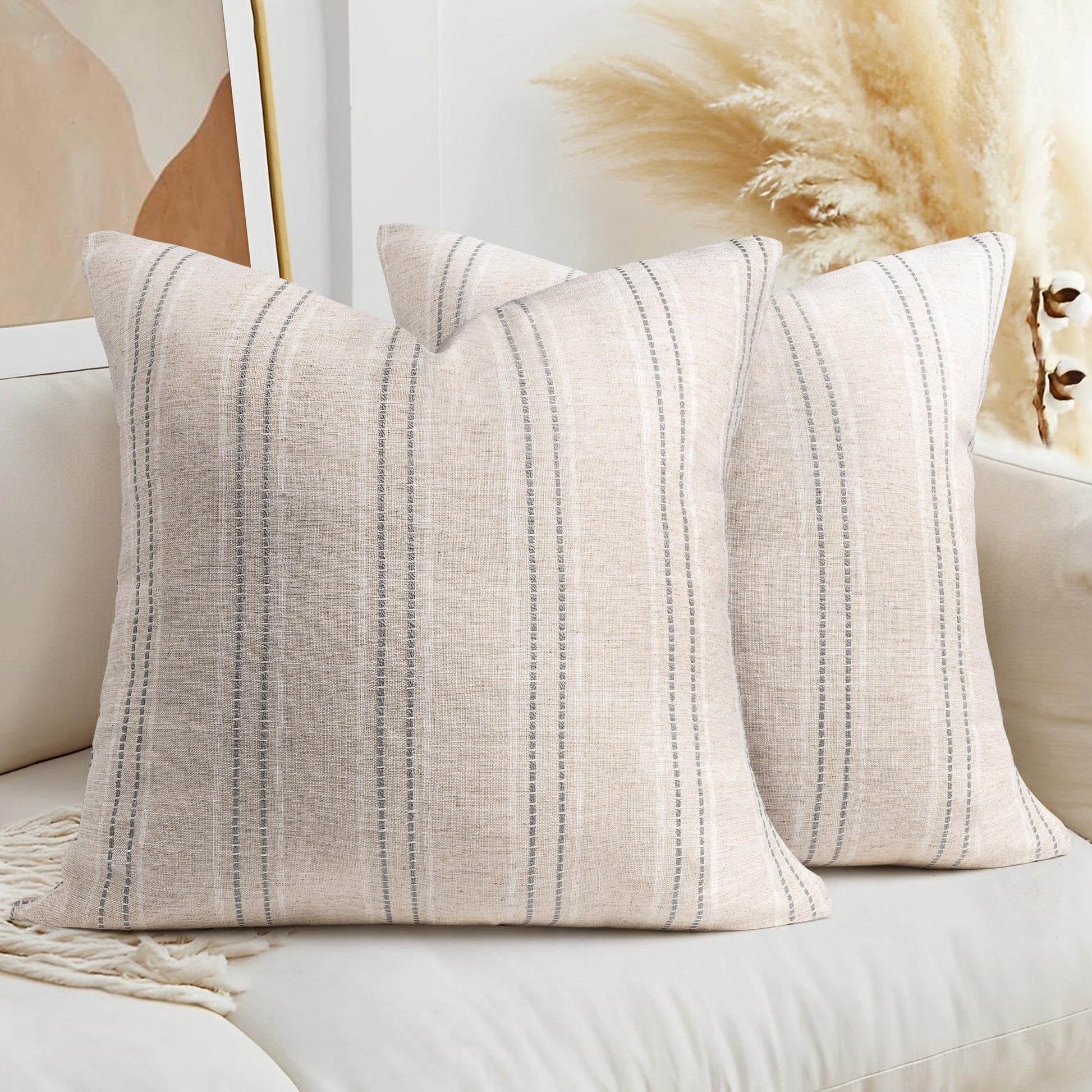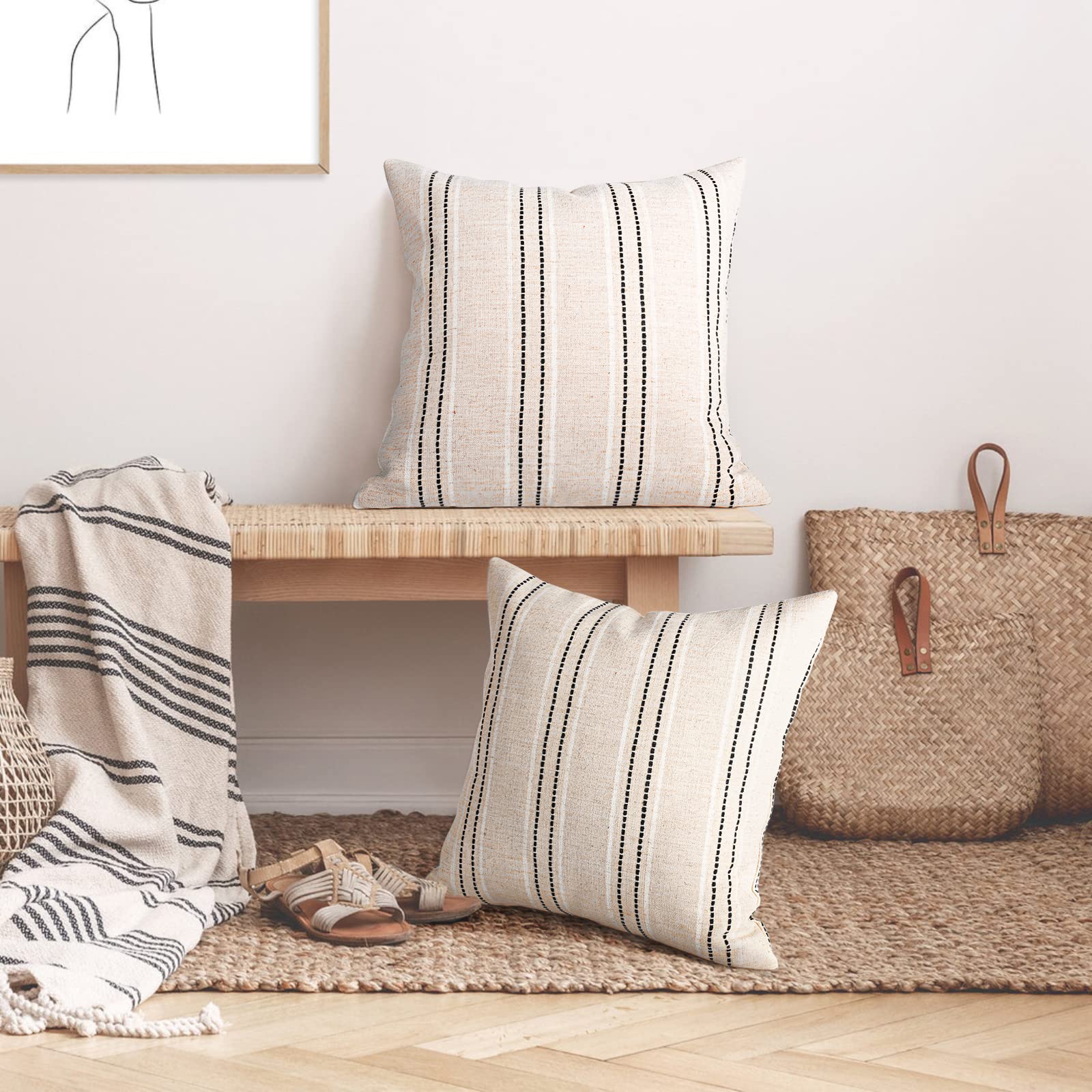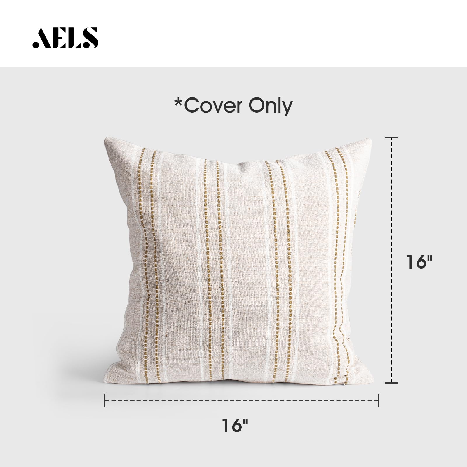 AELS 18x18 Decorative Farmhouse Linen Throw Pillow Covers, Boho Textured Pillow Case, Set of 2, Beige with White & Brown Stitch Yarn Dyed Stripe Cushion Cover for Sofa Couch Living Room (Cover ONLY)