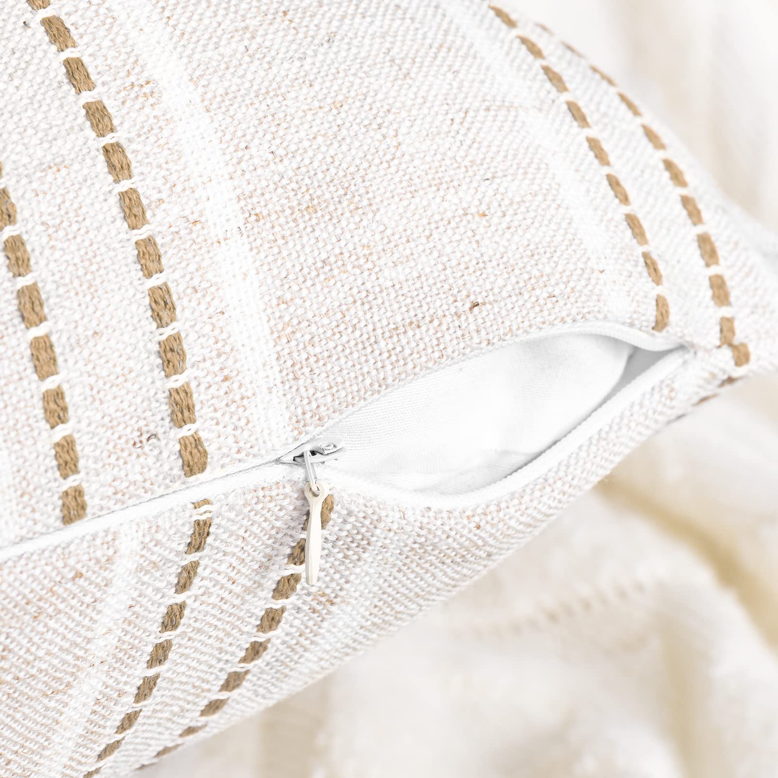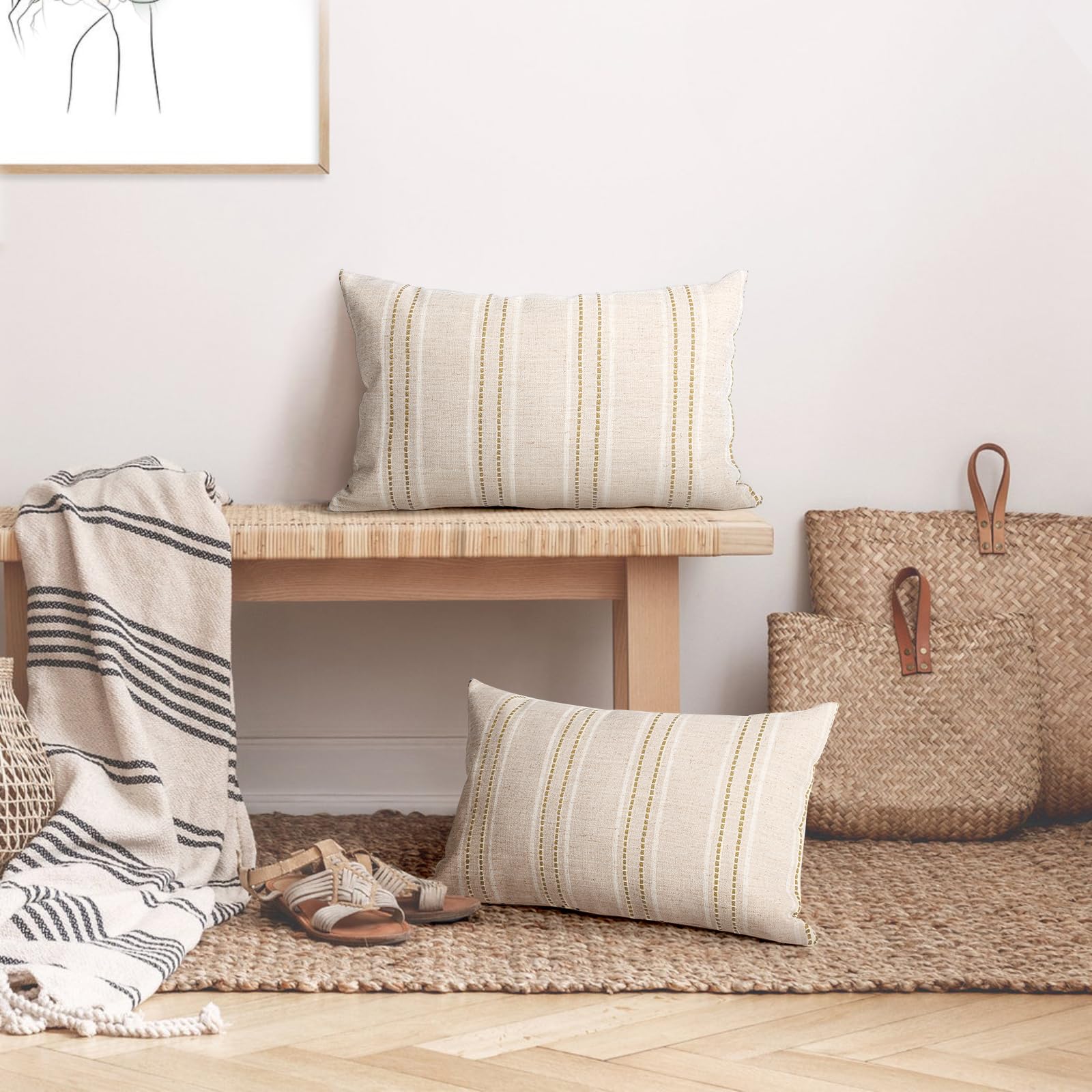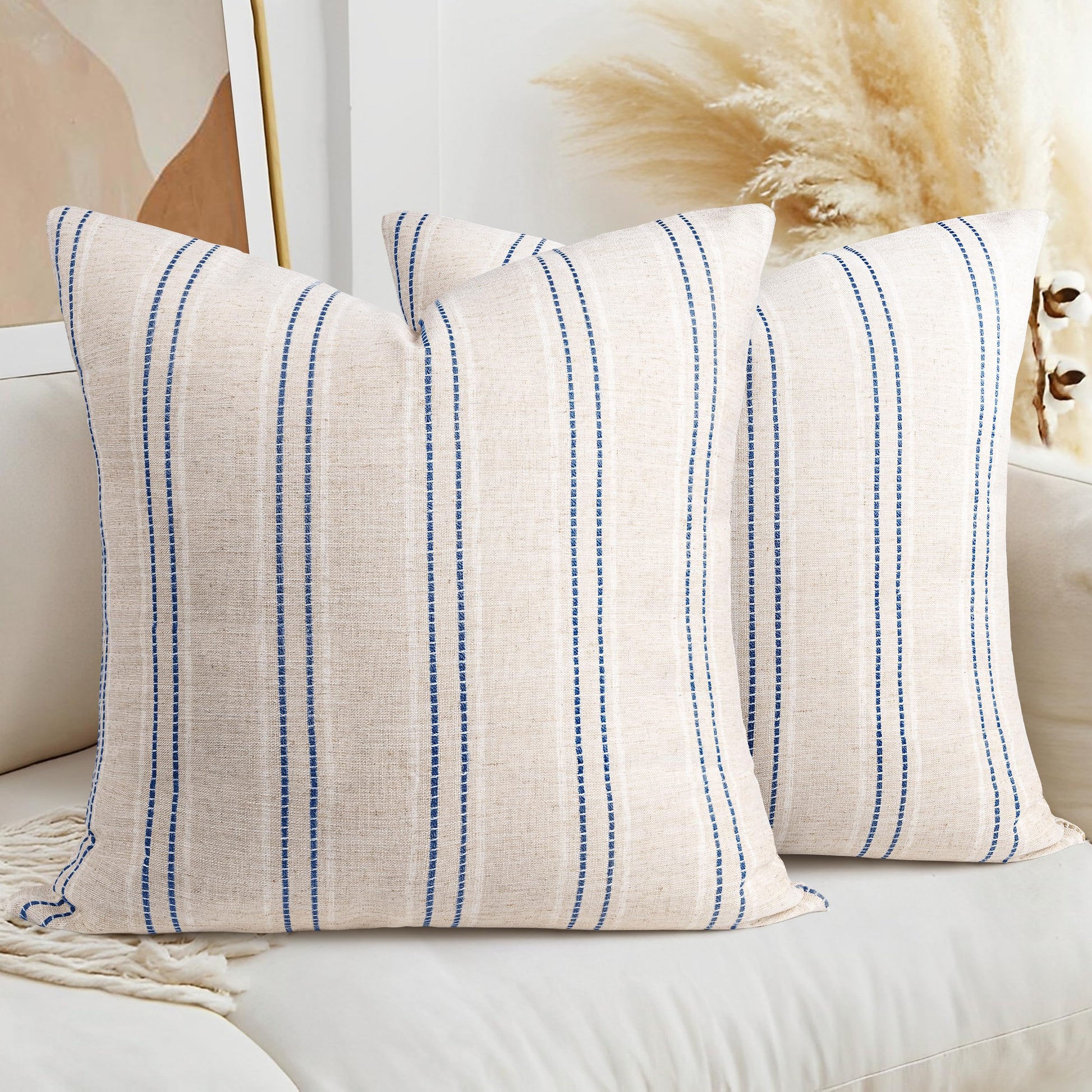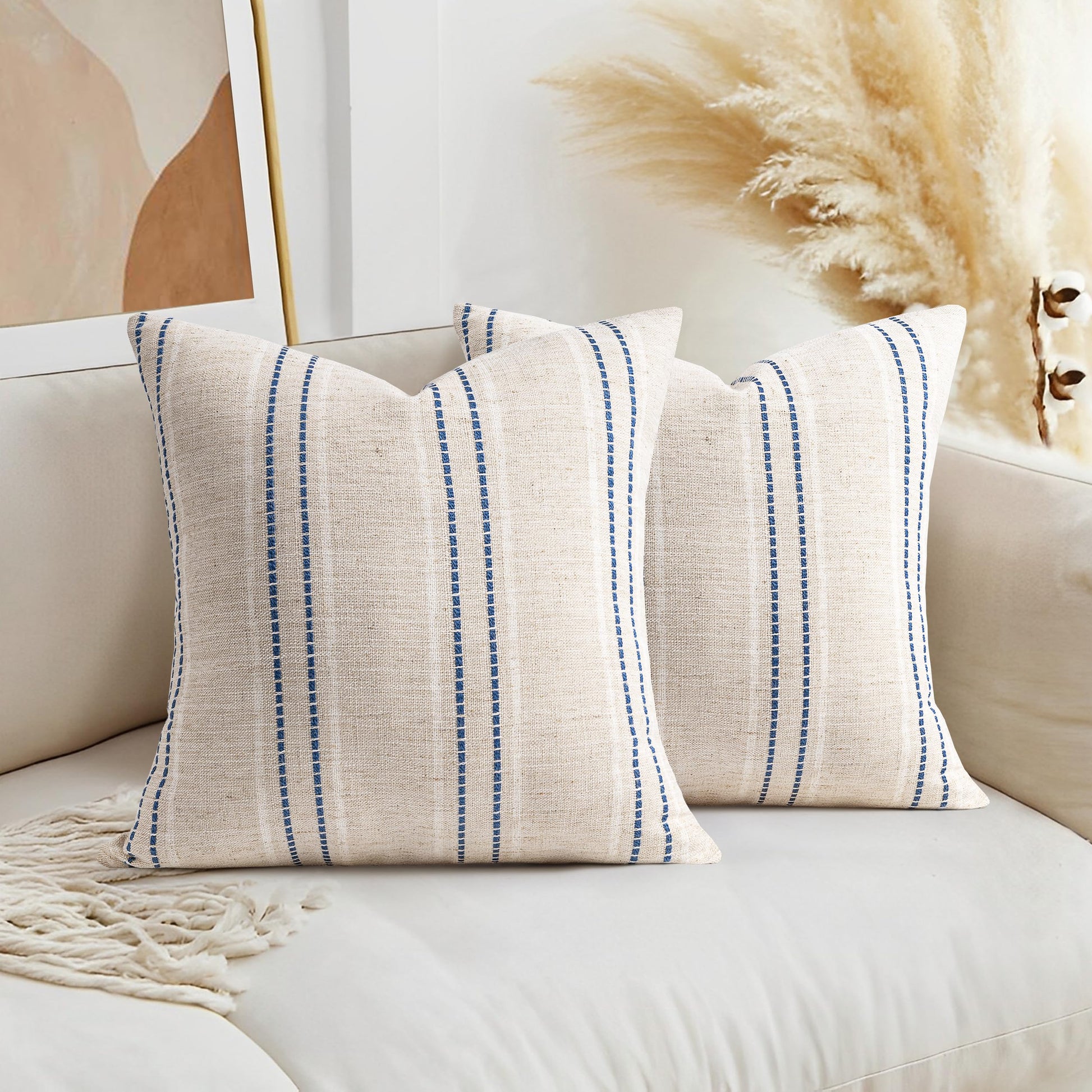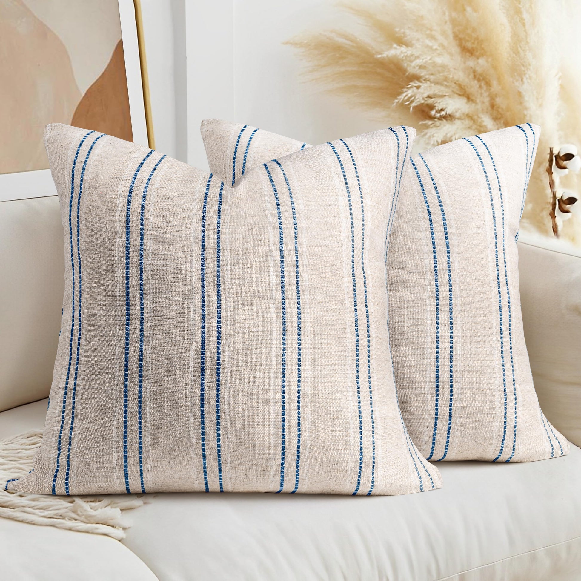 AELS 18x18 Decorative Farmhouse Linen Throw Pillow Covers, Boho Textured Pillow Case, Set of 2, Beige with White & Brown Stitch Yarn Dyed Stripe Cushion Cover for Sofa Couch Living Room (Cover ONLY)