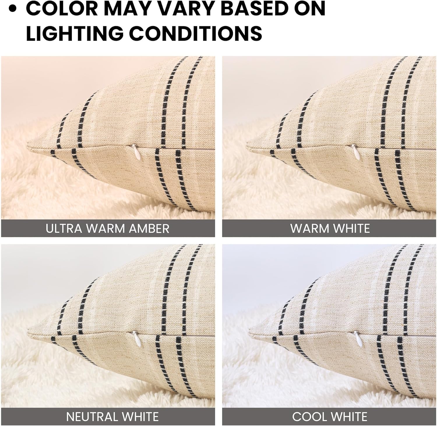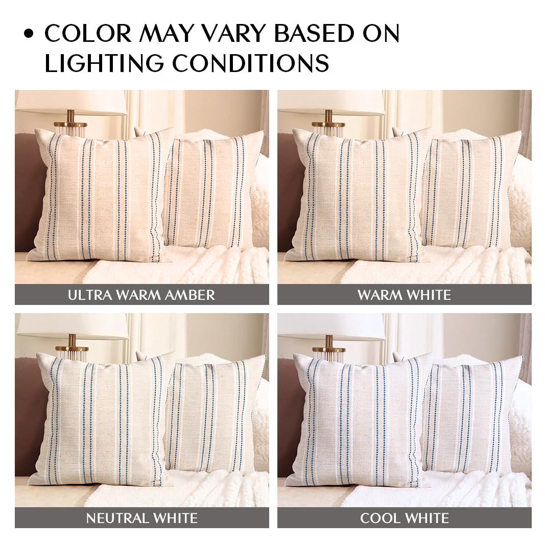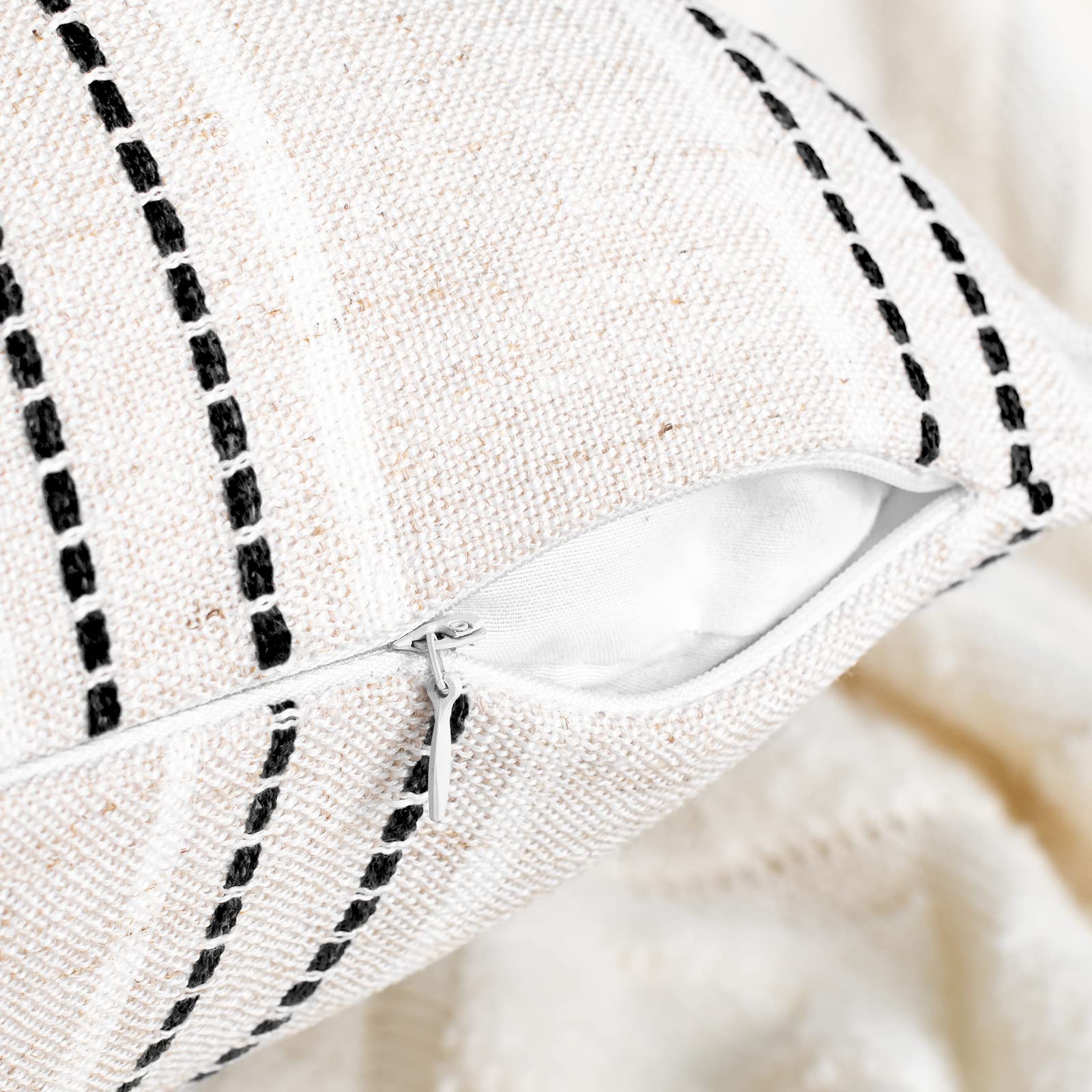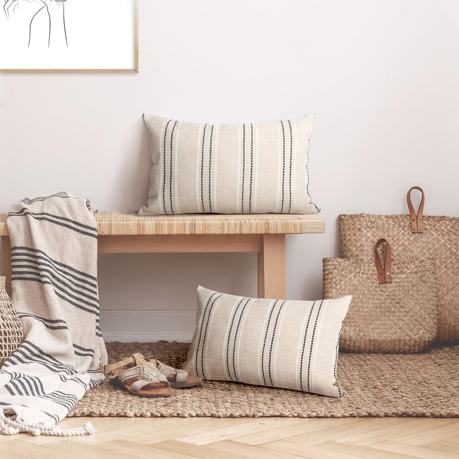 AELS 18x18 Decorative Farmhouse Linen Throw Pillow Covers, Boho Textured Pillow Case, Set of 2, Beige with White & Brown Stitch Yarn Dyed Stripe Cushion Cover for Sofa Couch Living Room (Cover ONLY)