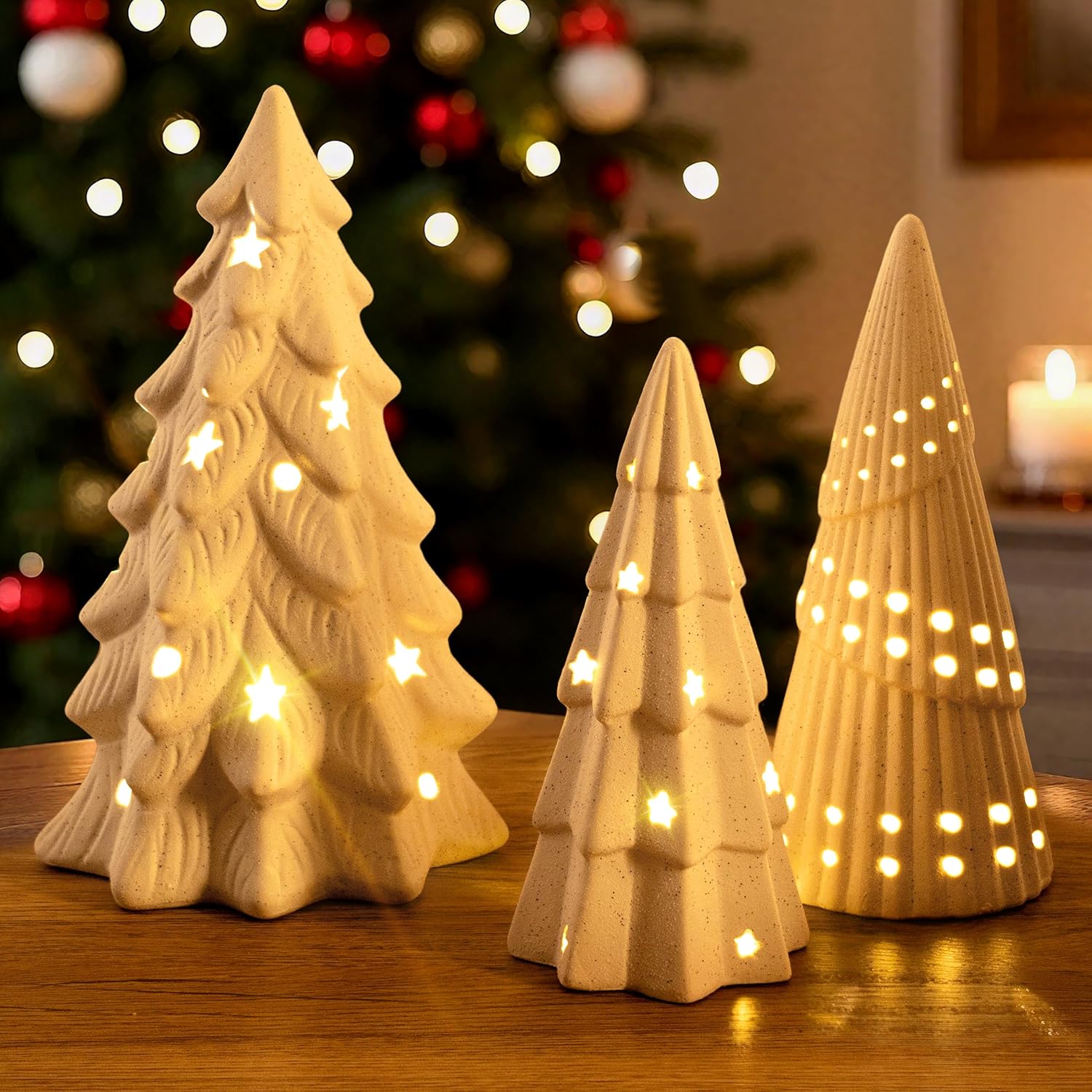 - Charming Holiday Accent: This set includes three ceramic Christmas trees that glow softly from within, adding a warm and festive touch to your home décor—perfect for mantels, shelves, countertops, or entryway displays